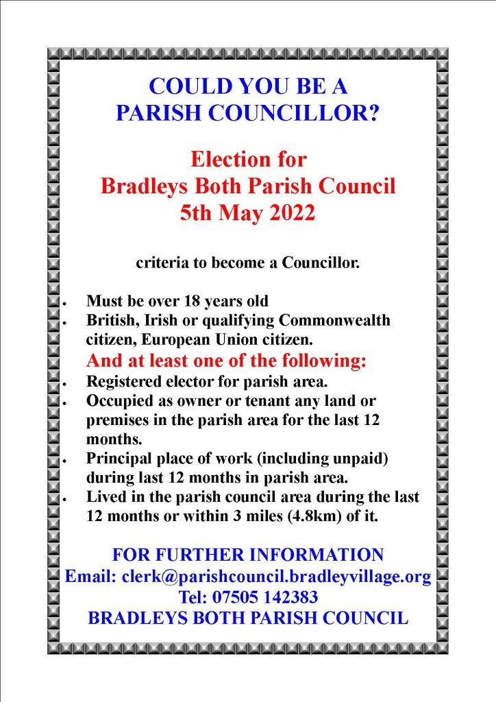 The election on 5th May includes Bradleys Both Parish Council. Would you like to be a Councillor for the parish? If you are interested, are over 18 years old and live in, (or within 3 miles of Bradley) you may be eligible to stand. The Parish Council has seven Members, if less than seven people apply to be a Councillor, those who do apply will be co-opted to the Council, if more apply, then an election will be held. If you would like further information please contact the Clerk (Mags) on clerk@bradleysboth-pc.gov.uk