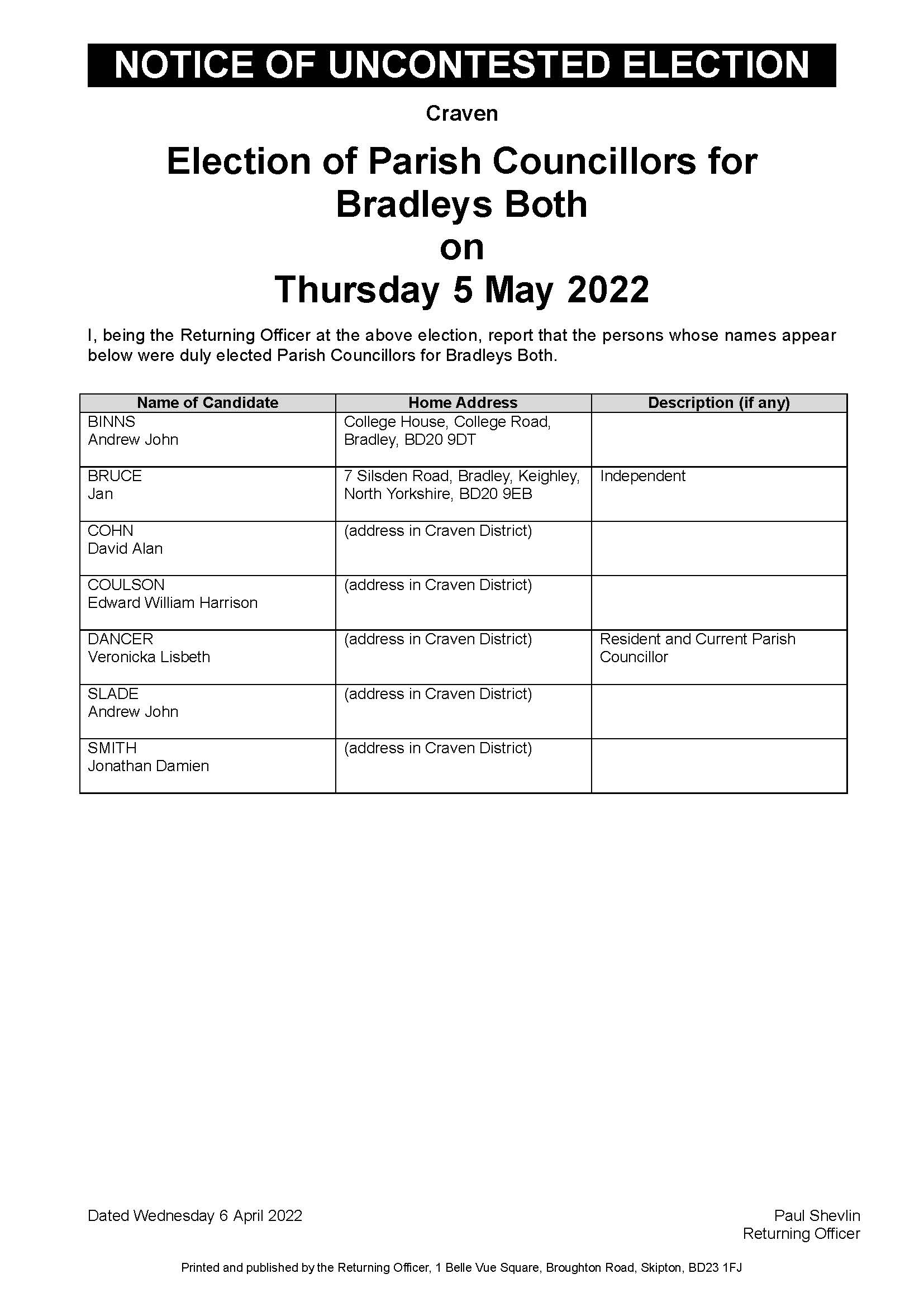 The election on 5th May includes Bradleys Both Parish Council. Would you like to be a Councillor for the parish? If you are interested, are over 18 years old and live in, (or within 3 miles of Bradley) you may be eligible to stand. The Parish Council has seven Members, if less than seven people apply to be a Councillor, those who do apply will be co-opted to the Council, if more apply, then an election will be held. If you would like further information please contact the Clerk (Mags) on clerk@bradleysboth-pc.gov.uk