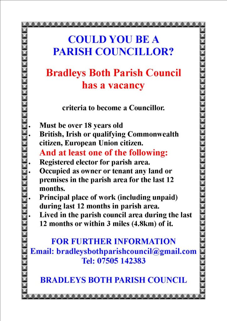There is still a vacancy on the Parish Council. If you live in the village, are over 18 yrs and on the electoral register you could make the difference. For more information contact the Clerk on clerk@bradleysboth-pc.gov.uk